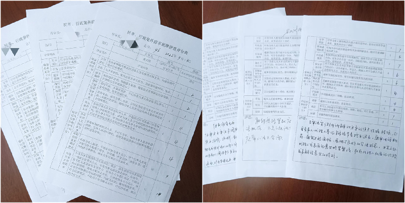 此次庭审,法官干警以良好的工作素养和扎实的业务水平完成了整个审判工作。庭审前,法官认真审阅了相关案件资料,分析研究了案情,审理时,主审法官秉承着公平公正的原则,严格按照法律规定、法定程序主持整个庭审,并围绕责任判定、案件事实、法律适用等问题进行了重点审查,引导双方就案件存在的争议点展开了举证、质证和辩论。从庭前准备、陈述请求、证据交换、法庭调查、法庭辩论,到最后陈述,整个庭审过程庄严肃穆、沟通流畅、节奏适当、井然有序,展现了良好的司法形象,成功地维护了法律的权威和当事人的合法权益。评查组聚精会神,零距离沉浸式地旁听了整个庭审过程。庭审结束后,评查组根据庭前准备、庭审过程、庭审结构、司法形象等情况给此次庭审做出了评价打分。