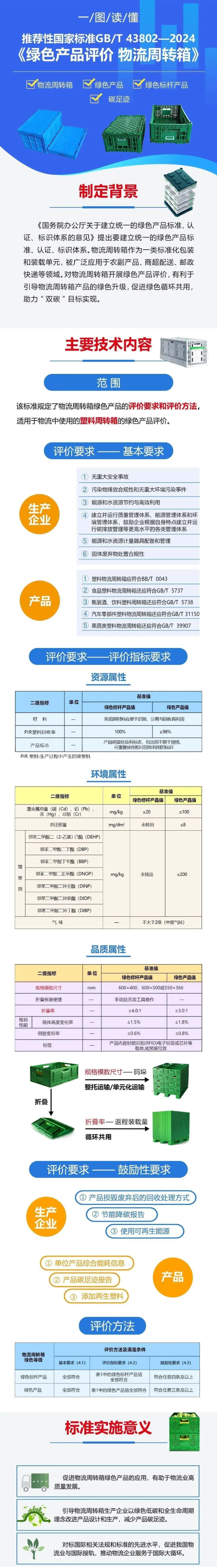 《绿色产品评价 物流周转箱》国家标准自7月1日起实施。该标准的实施应用将有利于建立统一的绿色产品标准、认证、标识体系,有效降低物流成本,提高经济运行效率。