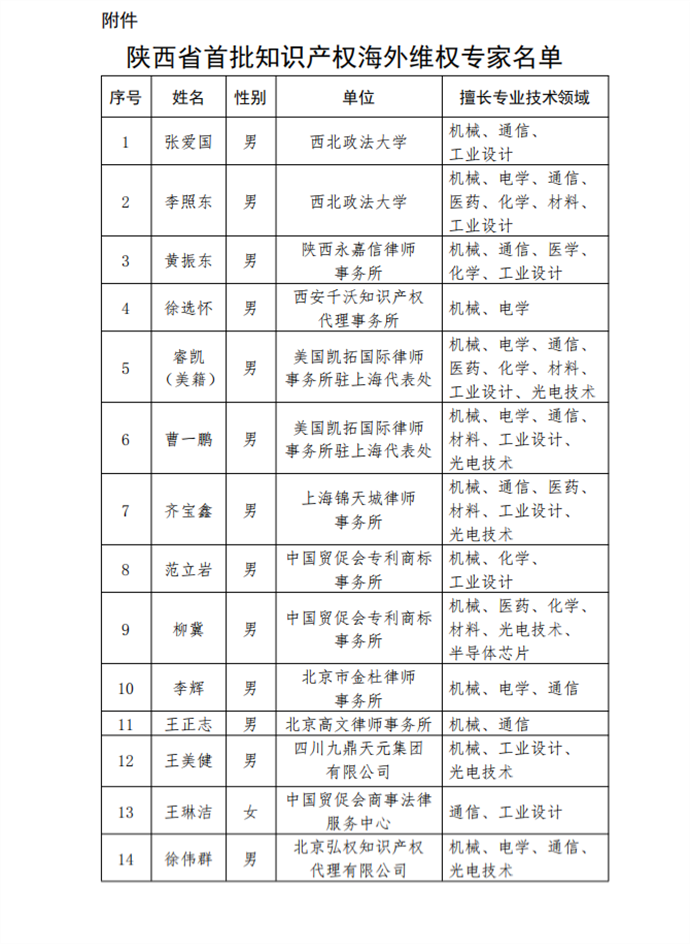 根据《关于征集陕西省首批知识产权海外维权专家的通知》(陕知发〔2021〕22号)精神,经省知识产权局会议研究,拟确定张爱国等14人为陕西省首批知识产权海外维权专家,现予公示。公示时间为5个工作日,自2021年9月7日至2021年9月13日。公示期间任何单位或个人对公示内容有异议,请以书面方式实名反映,注明凯发一触即发的联系方式。