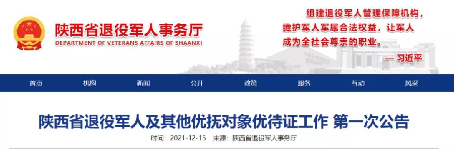 为深入贯彻习近平总书记关于退役军人工作重要论述,全面落实《中华人民共和国退役军人保障法》和国家有关规定,退役军人事务部于2021年12月14日正式启动退役军人、其他优抚对象优待证申领发放工作。结合陕西实际,现将有关事项公告如下。