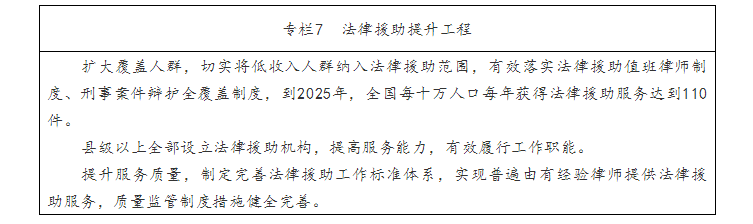 ——推动法律援助法实施。建立健全法律援助机构,实现县级以上法律援助机构全覆盖,配齐配强法律援助机构工作人员,有效履行国家责任。落实国家基本公共服务标准,强化质量监管,完善配套制度,完善法律援助服务标准体系,建立健全评价指标体系。