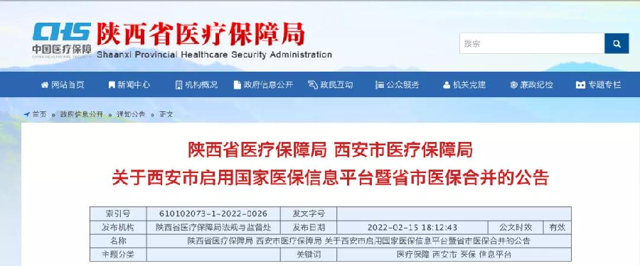 省本级现有医保信息系统将于2022年2月20日0时停止使用,同时省级医保业务移交西安市属地管理;自2022年2月28日0时起,启用国家新医保信息平台办理医保业务,按照移交政策,享受西安市医保待遇和管理服务。
